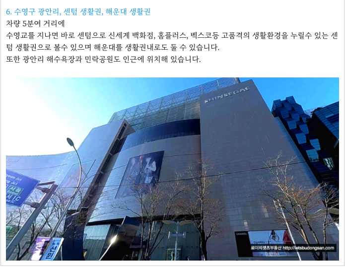 수영로를 통해 센텀의 신세계 백화점, 롯데백화점과 홈플러스 이용이 편리하고