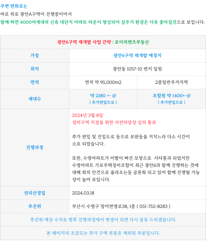 수영구 광안6구역 재개발 최근 진행과 앞으로 진행 일정 그리고 소액 인수가 매물 들 소개 드립니다.