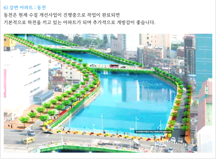 수질 개선작업 중인 동천을 끼고 있어서 개방감이 좋으며 강변 아파트로의 불리울수 있습니다.