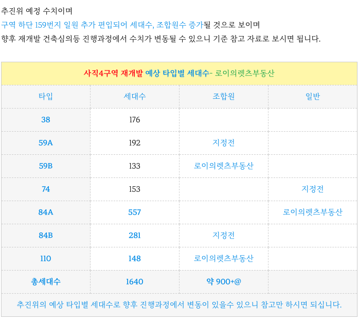 사직4구역 재개발 추정 타입별 세대수 입니다.