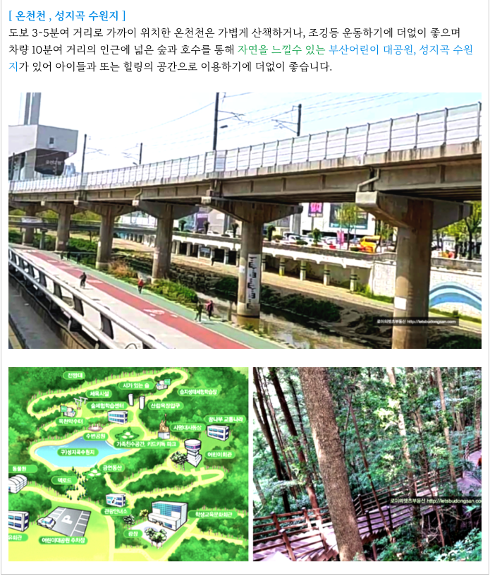 도보 3분여 온천천이 위치하고 있어서 산책, 휴식 운동하기데도 좋은 장점을 가지고 있습니다.