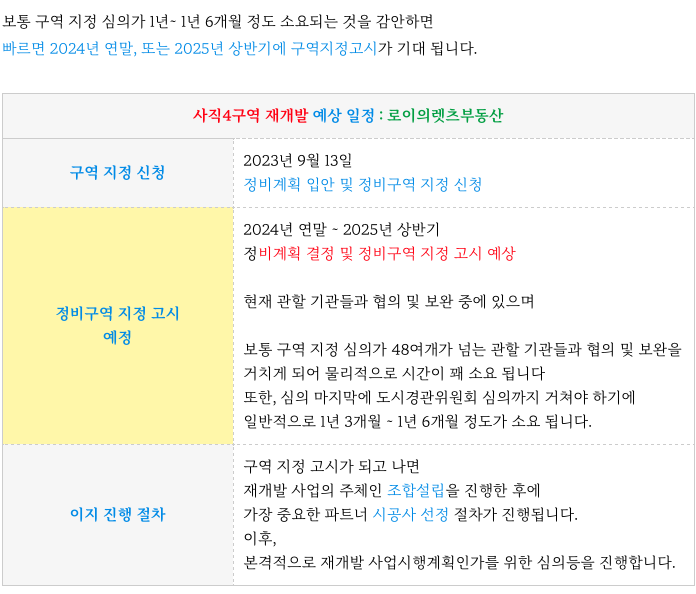 사직4구역 재개발은 현재 구역 지정을 위한 심의 및 보완, 협의중에 있으며