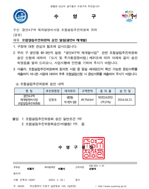 광안4구역 재개발은 4월 22일 조합설립추진위원회 승인을 받았습니다.