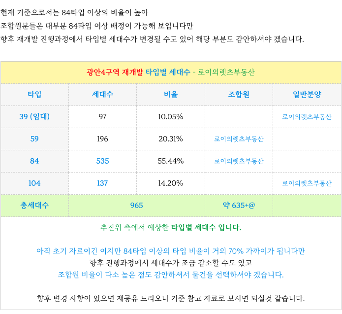 광안4구역 현 추정 예상 타입별 세대수 소개 드립니다.
