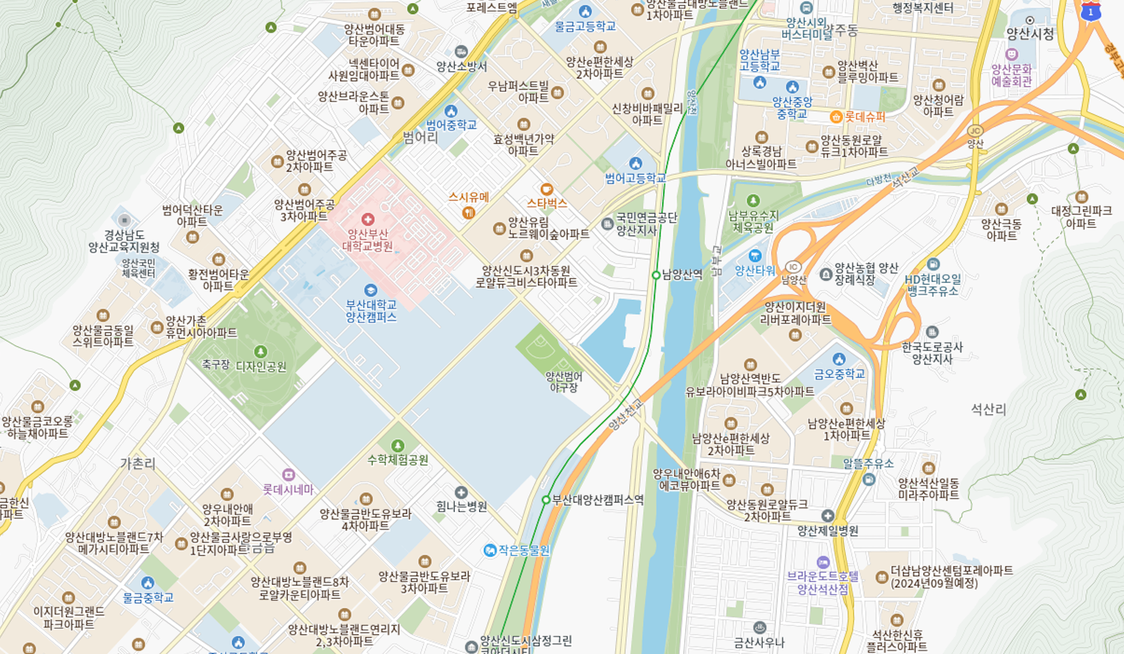 양산 부산대 병원 앞의 신도시 상가주택 택지에 위치하고 있으며