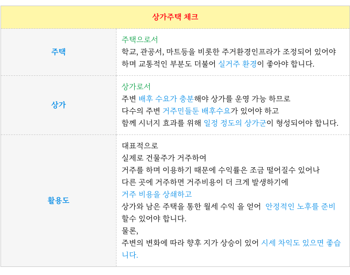 상가주택의 간략한 특징과 활용 부분 입니다.