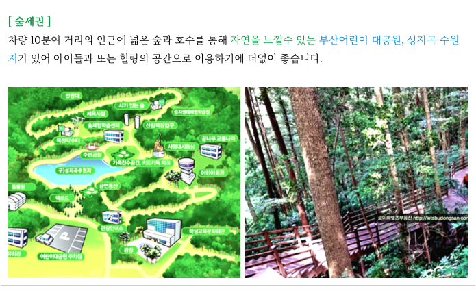 차량 10여분에 숲과 호수가 있는 초읍 성지곡수원지가 있어 아이와 함께 자연을 손쉽게 접할수 있습니다.