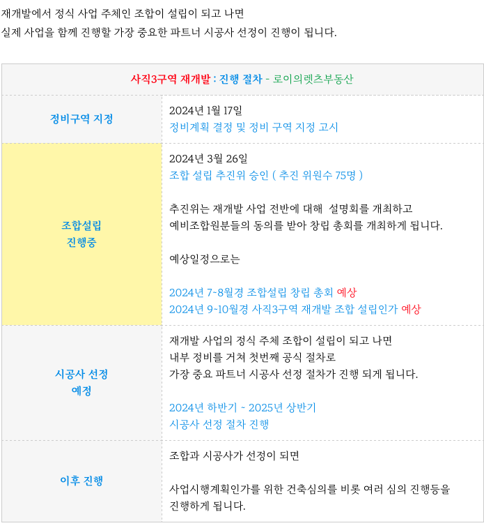 조합설립의 첫단계인 추진위 인가를 받았으며 2024년 9~10월경 조합설립인가가 기대 됩니다.