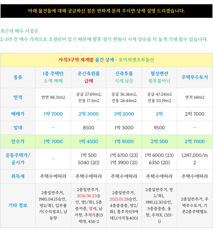사직3구역 재개발 현 시장 최저 매물들 먼저 소개드리겠습니다.