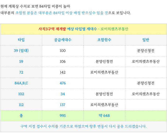 사직3구역 현 계획 타입별 세대수 소개드립니다.