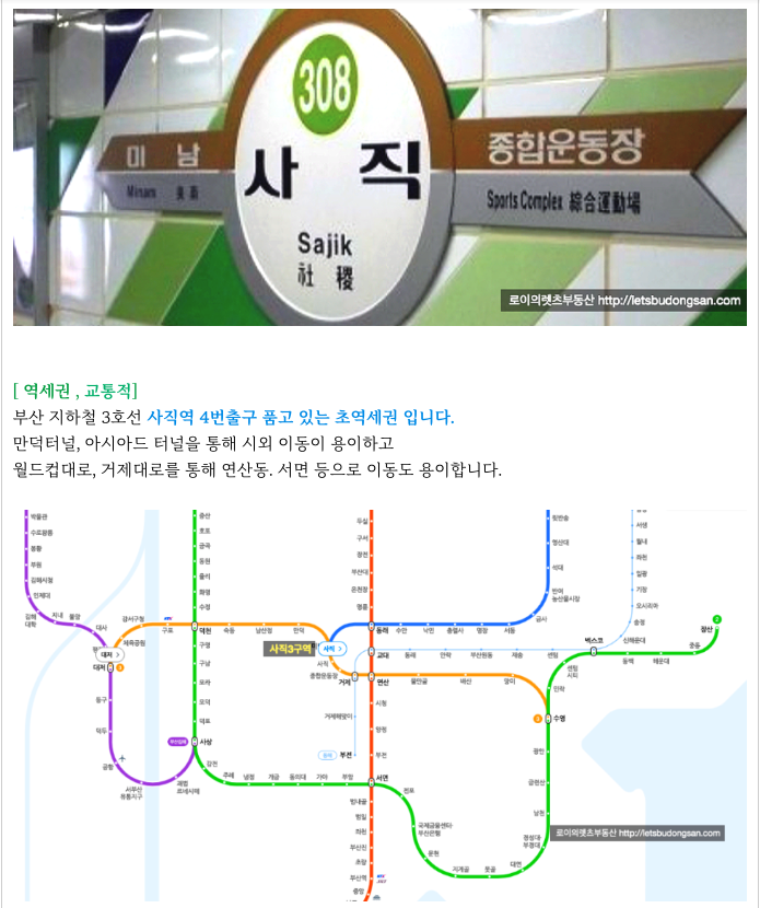 부산 지하철 3호선 사직역 품고 있는 초역세권 입니다.
