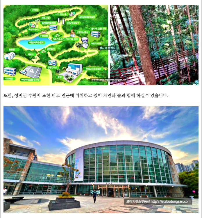 - 문화와 자연 : 부산국립국악원, 부산시민공원, 국제아트센터, 인근 성지곡 수원지.