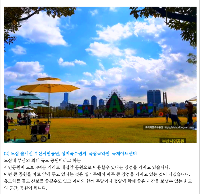 부산 시민공원은 현재로서도 좋지만 부산국제아트센터 (부산콘서트홀)이 현재 공사중으로