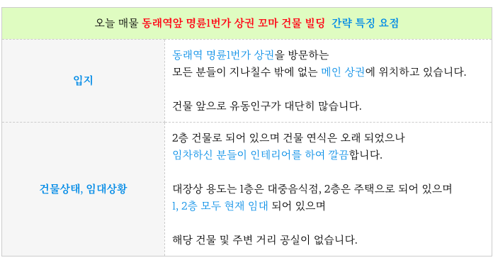 동래역 앞 명룬1번가 상권 2층 꼬마 건물 빌딩 매매 물건 제원 소개 드립니다.