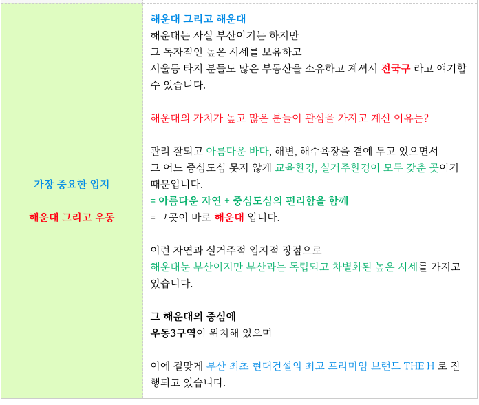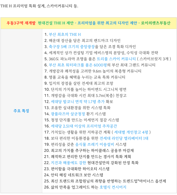 해운대 우동3구역 재개발 THE H 특화 제안 내용입니다.