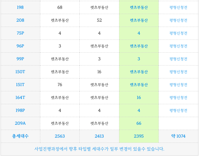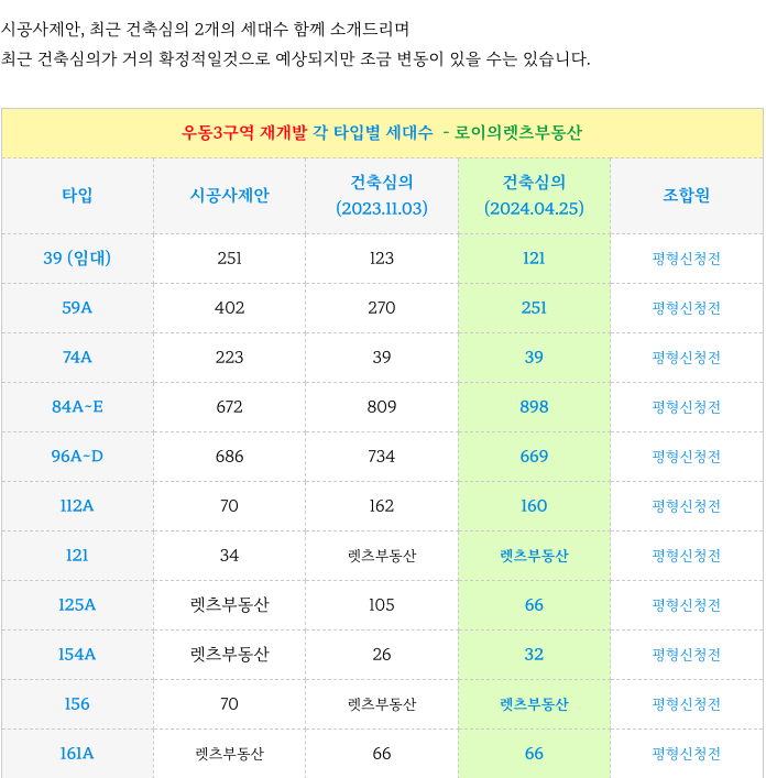 해운대 우동3구역 최근 2차례 건축심의 반영한 타입별 세대수 입니다.