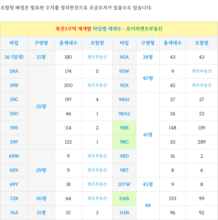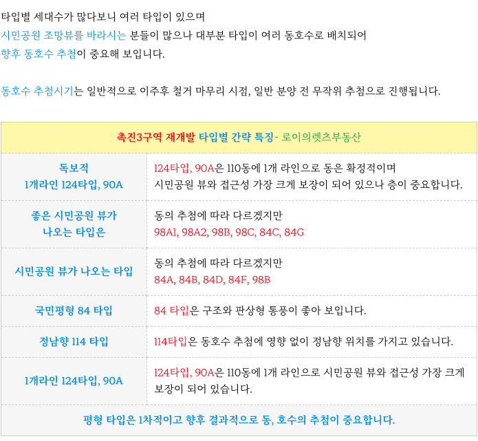 촉진3구역 재개발 타입별 조합원 배정과 각 세대수 소개 드립니다.