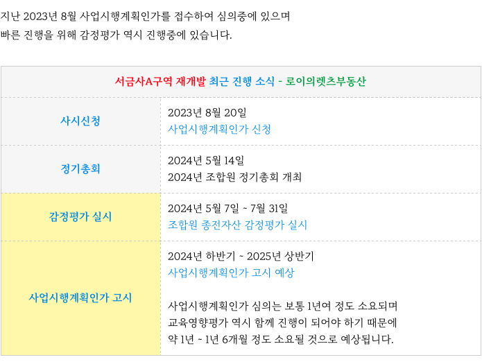 서금사A구역 현재까지의 일자별 주요 진행과 향후 일정 정리등 추가 정보는 아래 페이지를 참고 부탁드립니다.