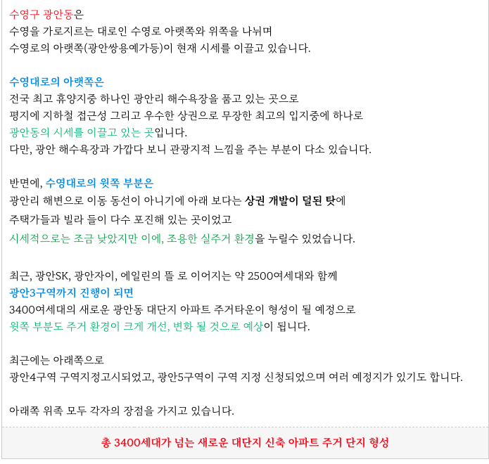 실거주 좋고 시세도 좋은 수영구, 그리고 그 중심인 광안동은 많은 분들의 선호지역 입니다.