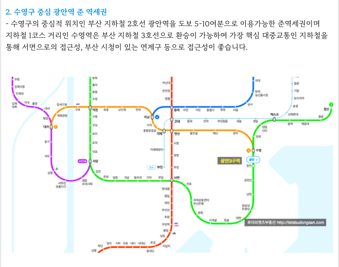 - 수영구 중심 광안역 준 역세권, 우수한 실거주 환경, 높은 시세