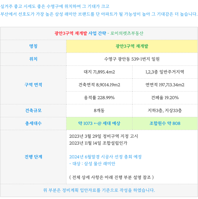 광안3구역 초기부터 일자별 주요 진행 부분과 이후 예상 일정 정리등 추가 정보는 아래 페이지를 참고 부탁드립니다.