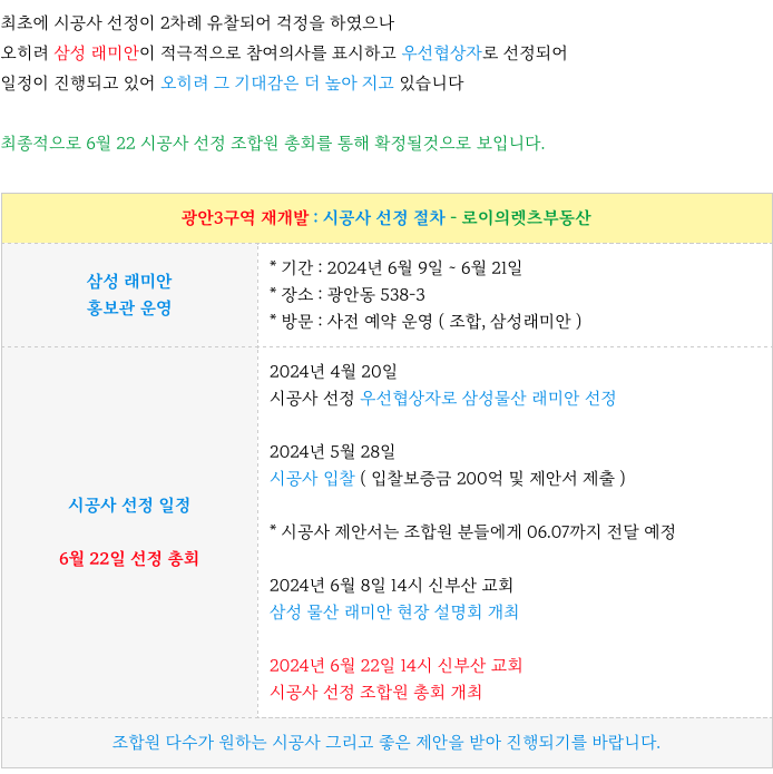 광안3구역 재개발 은 시공사 선정을 위해 착착 진행중에 있습니다.