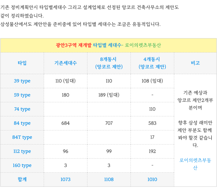 광안3구역 계획 타입별 세대수 입니다.
