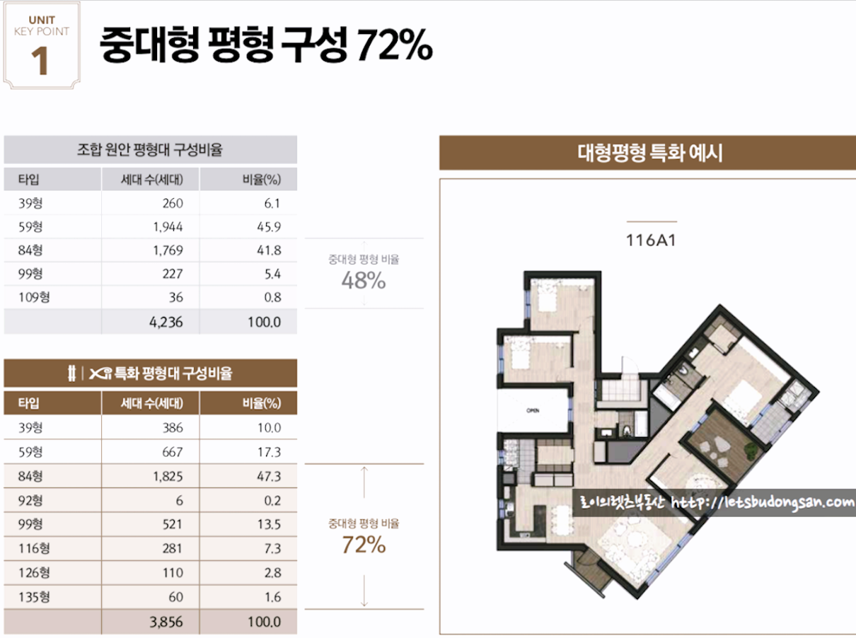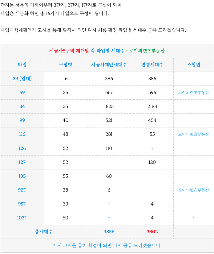 서금사5구역 현재 계획된 타입별 세대수 입니다.