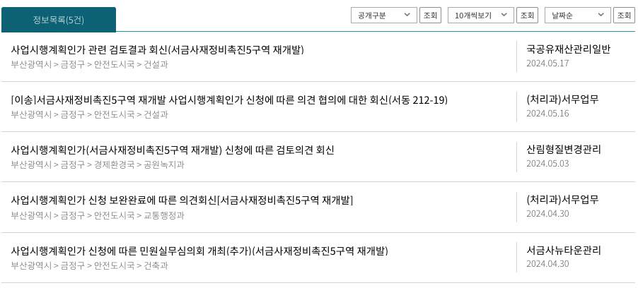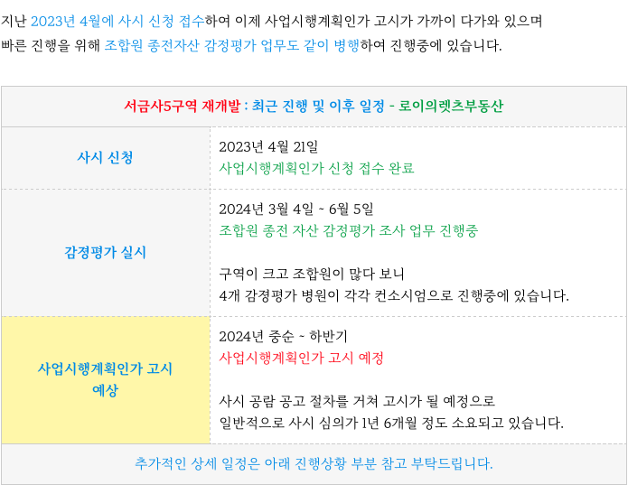 서금사5구역 진행 상황과 이후 일정 소개등 추가 정보는 아래 페이지를 참고 부탁드립니다.