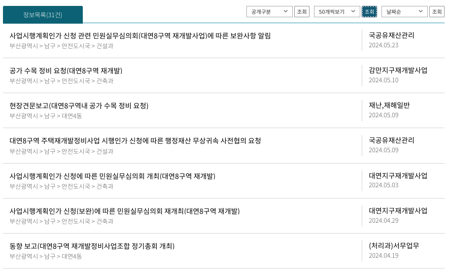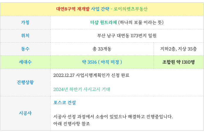 대연8구역 재개발 현재까지의 주요 일자별 진행 상황 정리 등 추가 정보는 아래 페이지를 참고 부탁드립니다.
