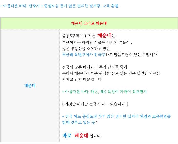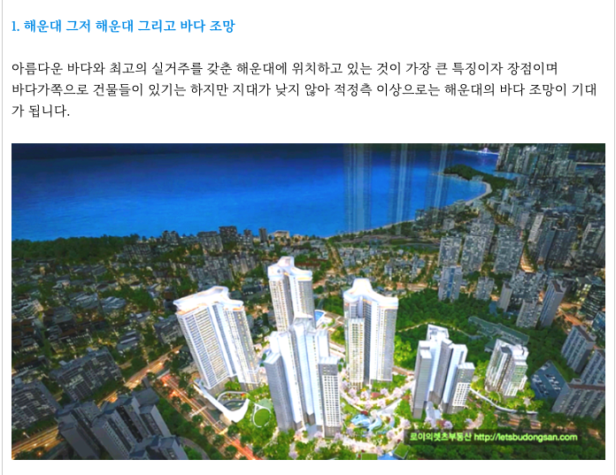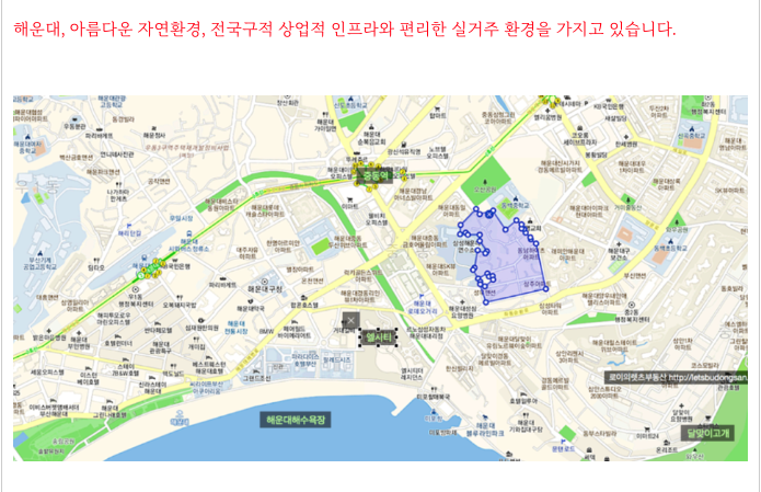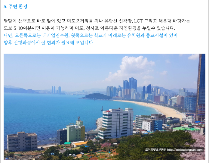 - 바다조망 + 해운대해수욕장, 전국적관광지 + 준역세권 우수한 실거주 환경.