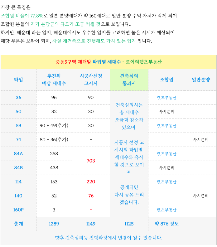 해운대 중동5구역 재개발 현재 추정 타입별 세대수 소개해 드리겠습니다.