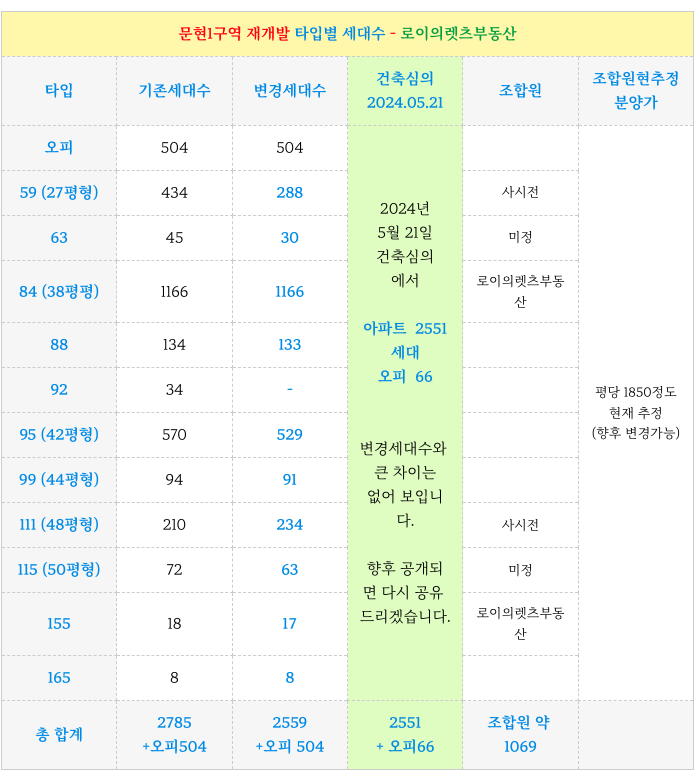 문현1구역 재개발 각 타입별 세대수와 추정 조합원 분양가도 소개해 드립니다.