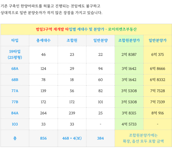 범일3구역 분양가 정보와 각 타입별 세대수 정리하였습니다.