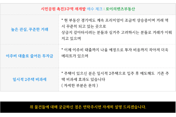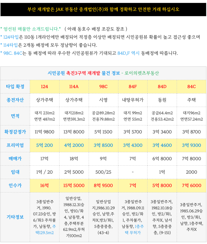 시민공원 촉진3구역 현 타입별 최저 매물 정리하였습니다.