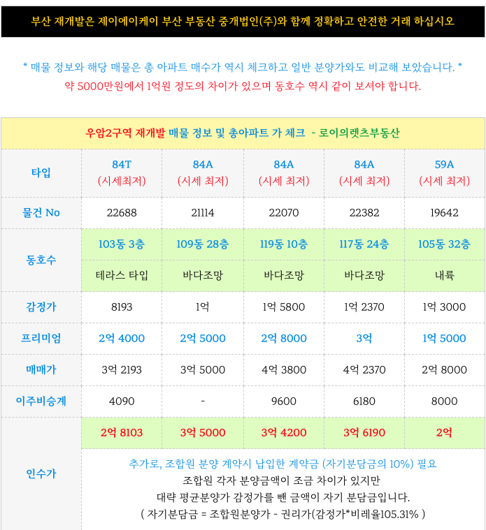 (제니스오션시티) 우암2구역 재개발 : 타입별 조합원 입주권 매물 - 총 아파트 매수가