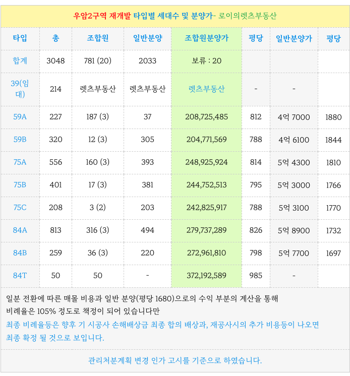 우암2구역 일반, 조합원 분양가 및 타입별 세대수 정보 소개해 드립니다.