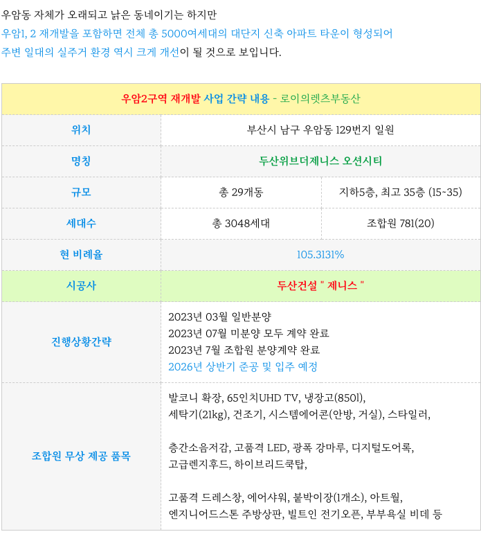 두산 위브 더 제니스 오션시티 주요 일자별 진행 사항 정리등 추가 정보는 아래 페이지를 참고 부탁드립니다.