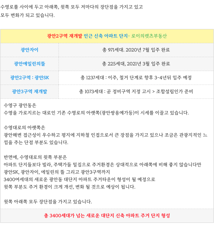 광안2구역 재개발 이 위치한 광안동의 주변 상황을 정리해 드리겠습니다.