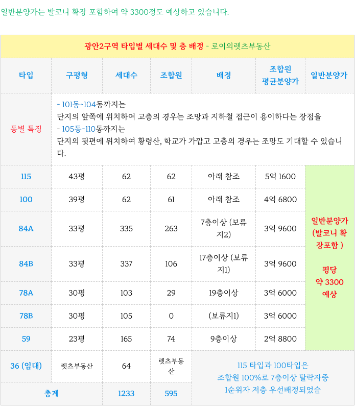 광안2구역 재개발 조합원 평균 분양가 및 타입별 세대수 소개 드립니다.