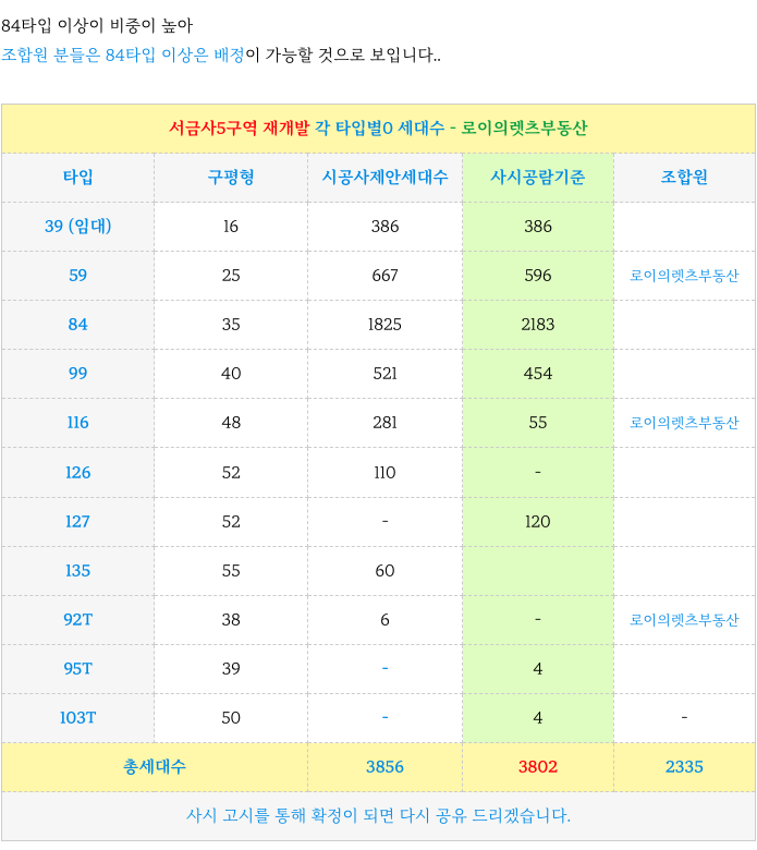 서금사5구역 재개발 타입별 세대수 소개해 드리겠습니다.