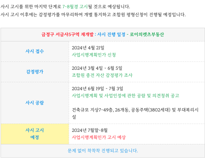 서금사5구역 재개발 주요 일자별 진행, 이후 절차 일정 등 정리등 추가 정보는 아래 페이지를 참고 부탁드립니다.