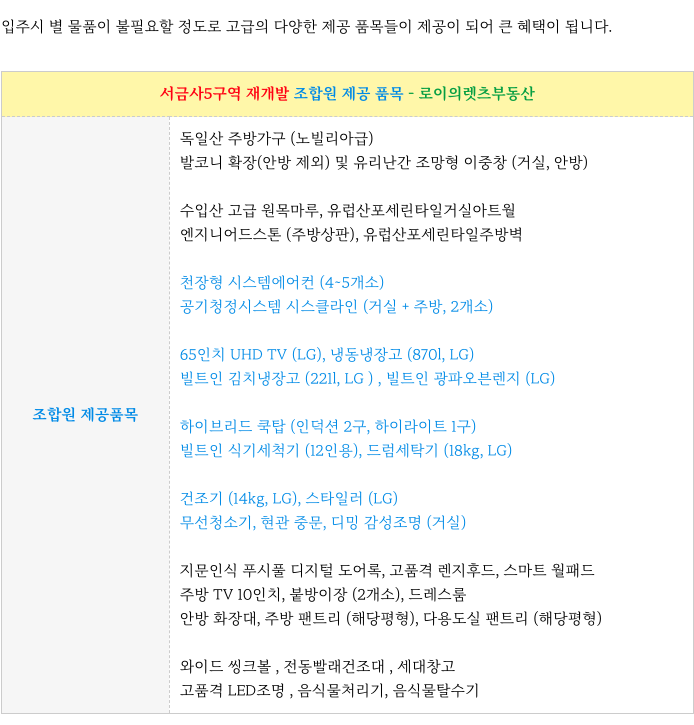서금사5구역 재개발 조합원 제공 품목 정리하였습니다.