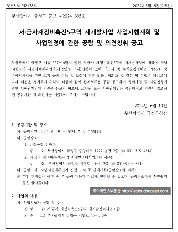 사시 공람 공고 시작된 서금사5구역 최근 1.75 최저 매물 및 진행 소식, 일정 등 소개해 드리겠습니다.