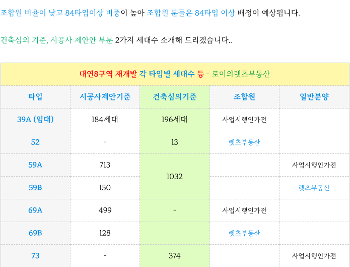 대단지 대연8구역 현 계획 타입별 세대수 정리 드리겠습니다.