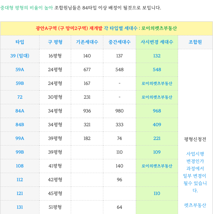 광안A구역 재개발 타입별 세대수 소개해 드리겠습니다.