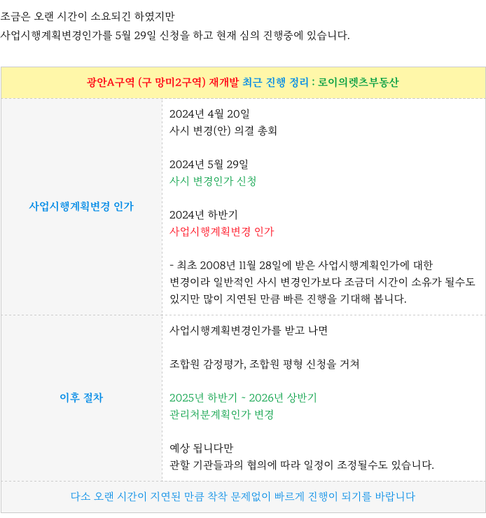 광안A구역은 사업시행계획인가 변경 신청을 하고 심의 중에 있습니다.