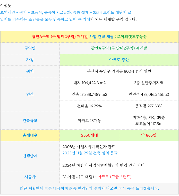 광안A구역 재개발 최저 매물 & 최근 사시 변경 신청 등 진행 소식 정리 드리겠습니다.