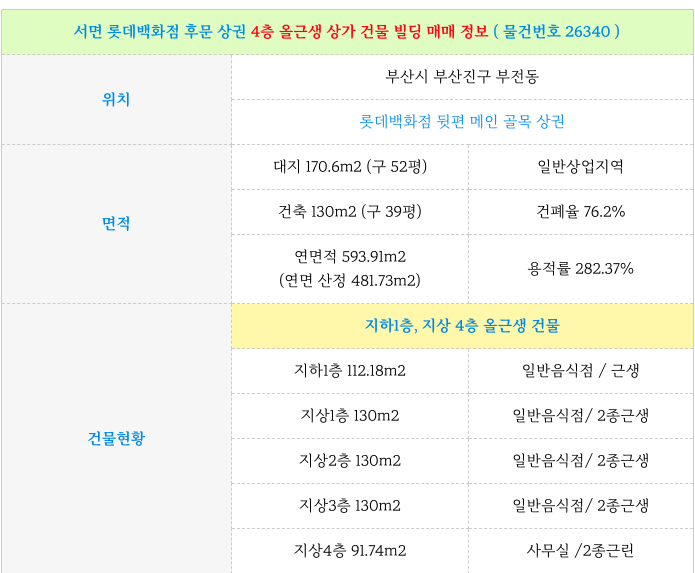 서면 롯데 백화점 후문 메인 상권 4층 올근생 상가 건물 빌딩 매매 물건 소개드립니다.