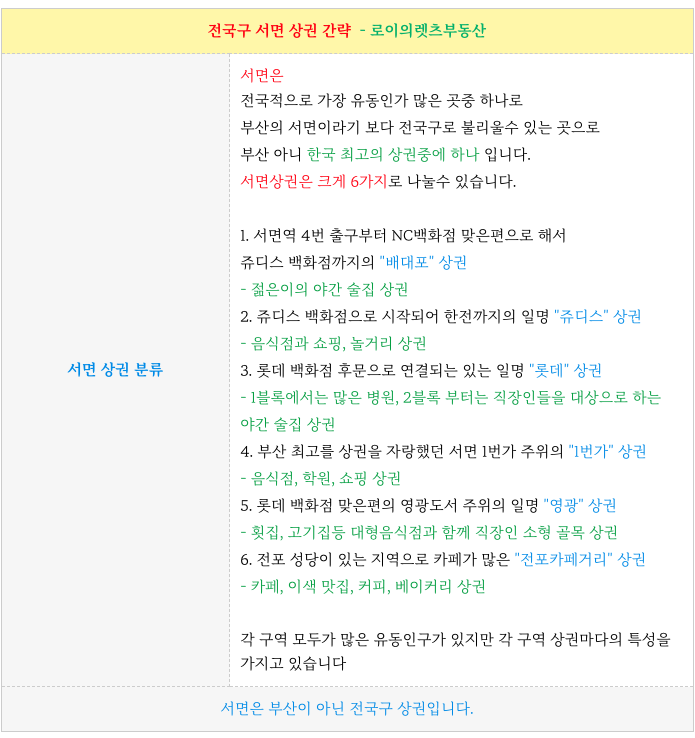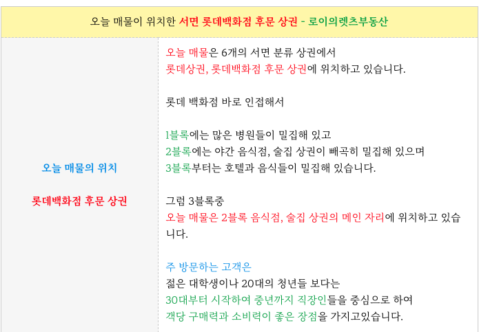 오늘 물건이 위치한 서면 롯데백화점 상권의 특징을 다시 정리하였습니다